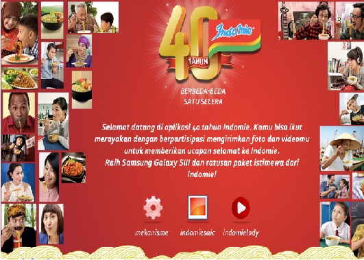 Di ulang tahunnya yang ke 40 ini, Indomie akan membagi-bagikan 5 buah Samsung Galaxy S III dan 100 paket Indomie untuk masing-masing kategori. Caranya gampang, kamu tinggal upload foto sedang makan indomie atau bikin video jingle indomie yang harus diupload di sini.
